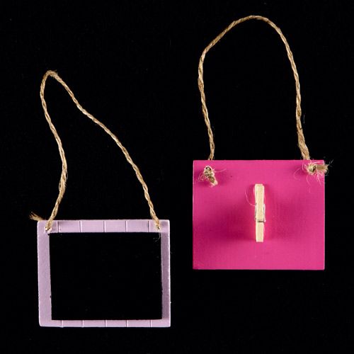 Set de 3 Pancartes ardoise en bois peint avec une mini pince à linge en bois fixée au verso pour tenir une étiquette et avec une cordelette de chanvre permettant de la suspendre.