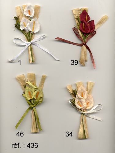 2 Bouquets composés chacun de 3 arums,de feuillage, de raphia et de ruban.