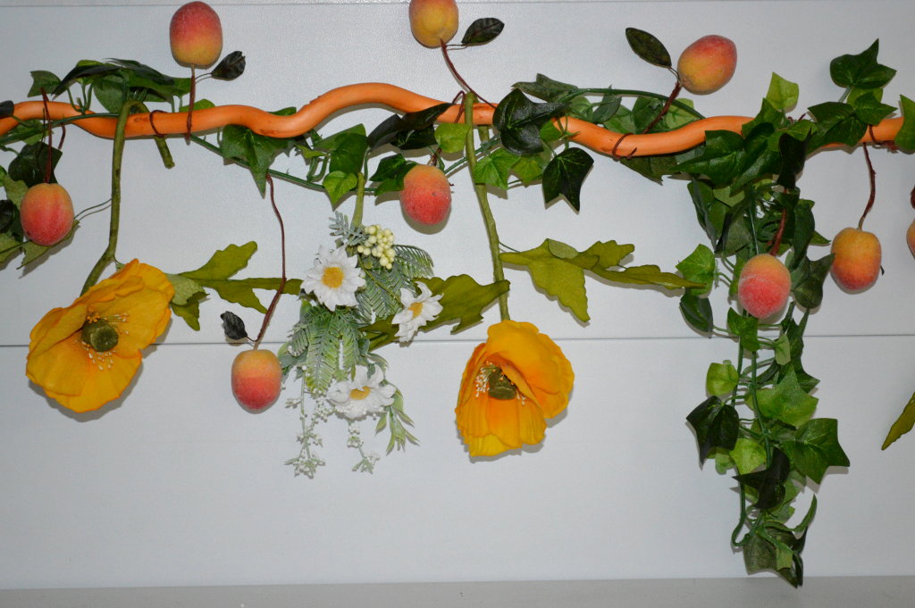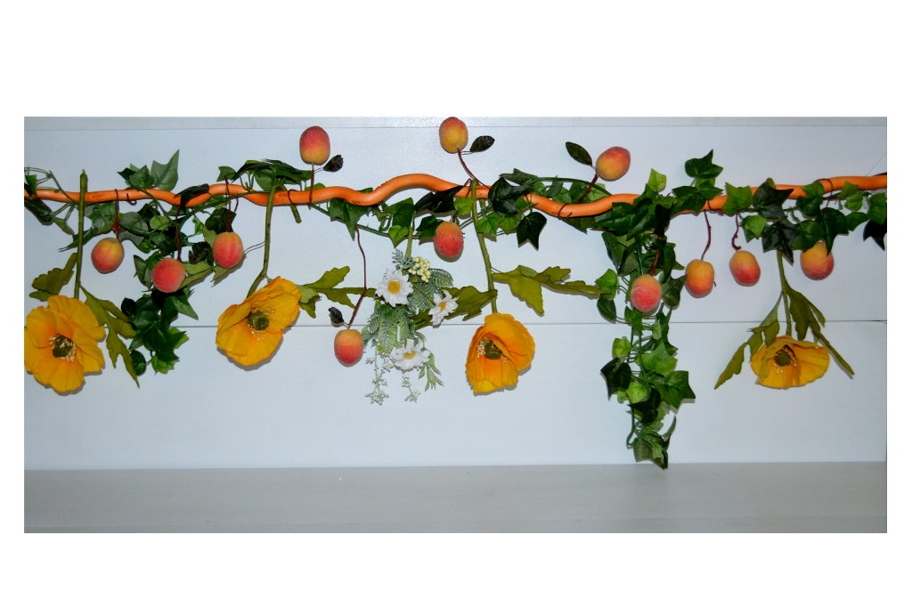Guirlande d'automne nature, décorée de feuillage, fleurs et fruits, à suspendre au fronton de votre boutique, au dessus de la caisse...